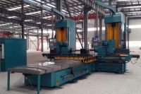 數(shù)控五軸雙立柱鏜床為臥式雙面布置,主要適合加工對(duì)稱度要求高的孔的鏜削加工。并能附帶高速銑削、 低速銑削、鉆孔等功能。工件放在專(zhuān)用移動(dòng)工作臺(tái)上,左右分別兩個(gè)立柱帶可橫向移動(dòng)的滑臺(tái),滑臺(tái)上放動(dòng)力頭。移動(dòng)工作臺(tái)、橫進(jìn)滑臺(tái)及立柱滑臺(tái)由數(shù)控系統(tǒng)控制,主軸轉(zhuǎn)速通過(guò)變頻器調(diào)速。該機(jī)床由一套五軸數(shù)控系統(tǒng)控制,配備兩套懸掛式控制箱,并配可持式手脈。機(jī)床配有獨(dú)立的液壓站,能夠?qū)崿F(xiàn)立柱滑臺(tái)的自動(dòng)鎖緊。運(yùn)動(dòng)部分采用滾珠絲杠連接。機(jī)床配有獨(dú)立的電器柜,并有風(fēng)冷裝置。